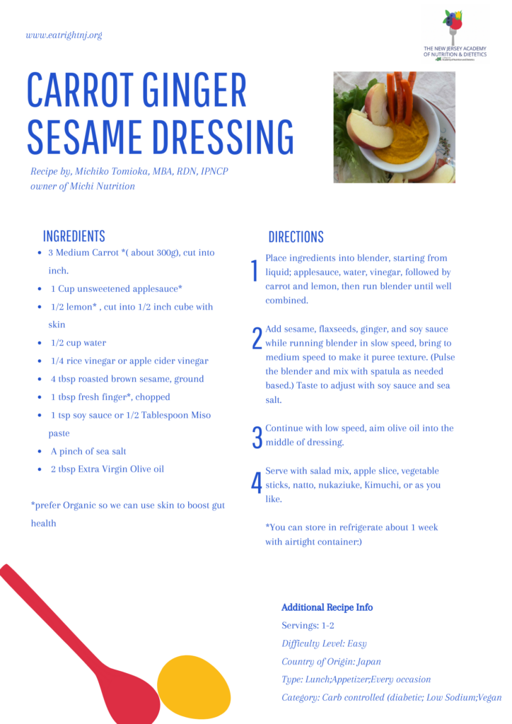This Carrot Ginger Sesame Dressing was created by Michiko Tomioka MBA, RDN, IPNCP of Michi Nutrition in New Jersey. It’s just one of the delicious recipes from our E-Book.